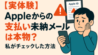 結論|Appleを名乗る支払い未納メールは詐欺の可能性があります結論からお伝えします。Appleを名乗る「支払い未納」「クレジットカード不正利用」のメールは、見た目が本物でも詐欺の可能性があります。我が家では、結果的に約6万円以上の被害を防...